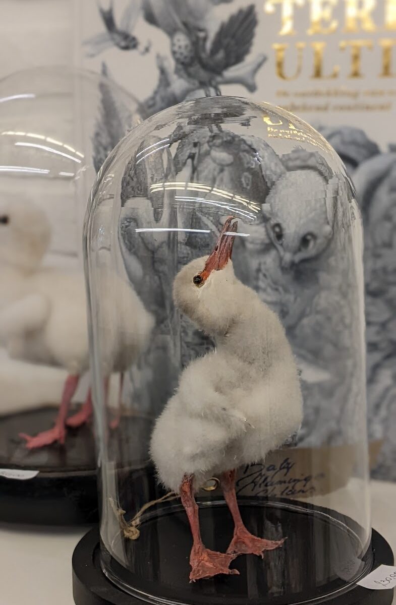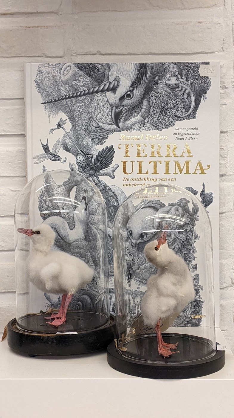 Neen, een jonge flamingo is niet roze, maar fel donzig wit. De pootjes en snavel kleuren daarentegen al wel mooi roze. Hij staat in een stolpje, want wanneer zie je nu eigenlijk een baby flamingo?