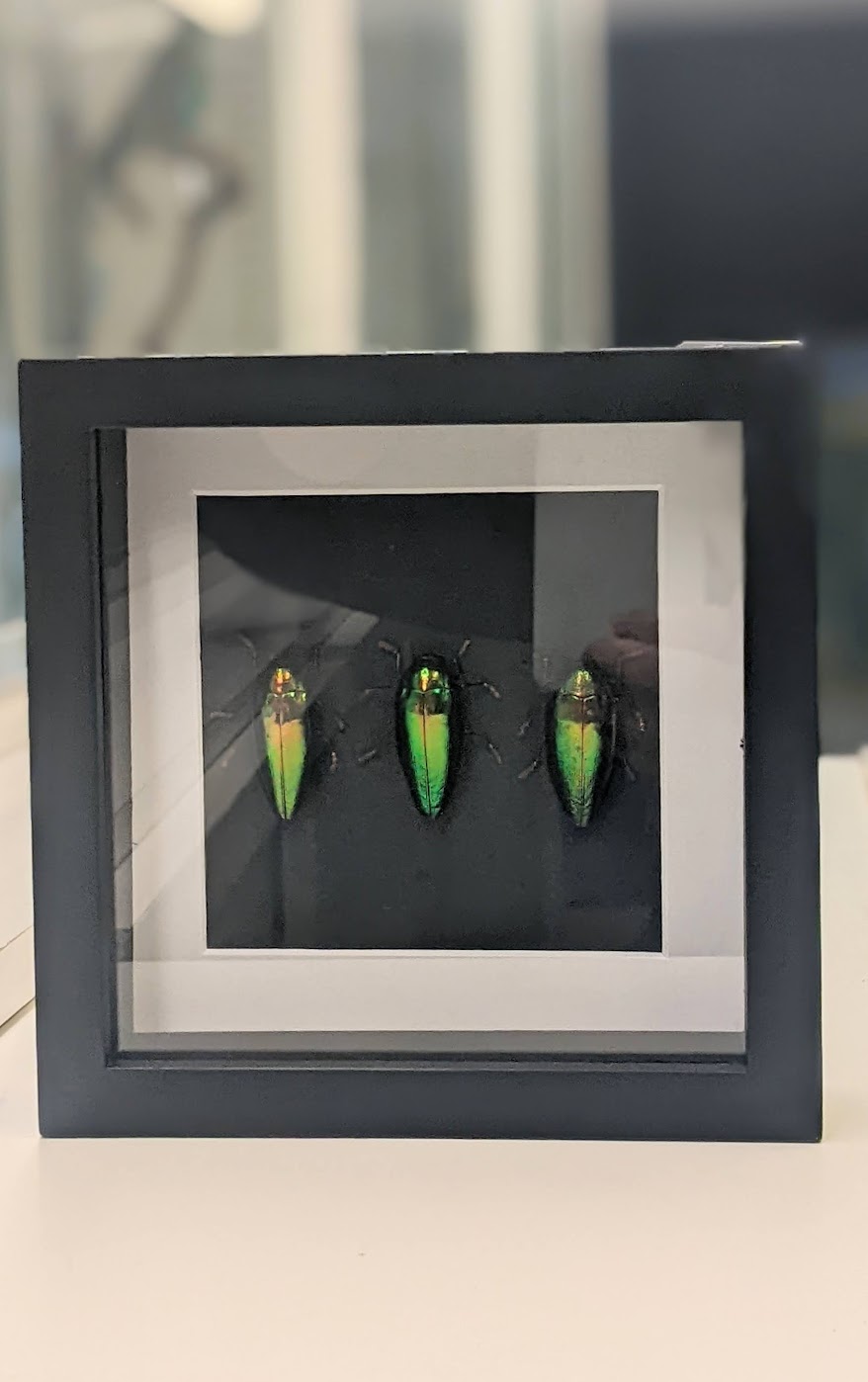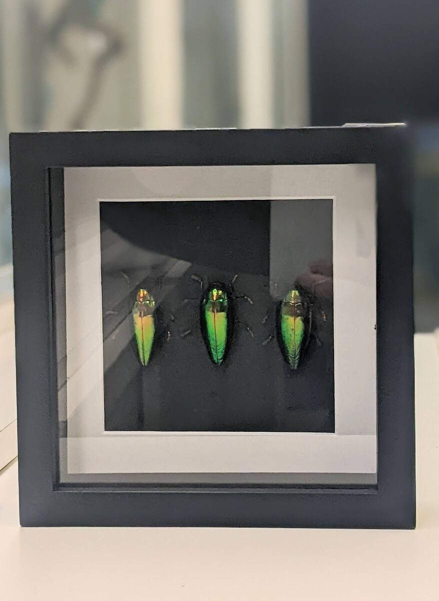 Houten kwaliteitsvolle museumkader met drie groene juweelkevers op een zwarte achtergrond.
