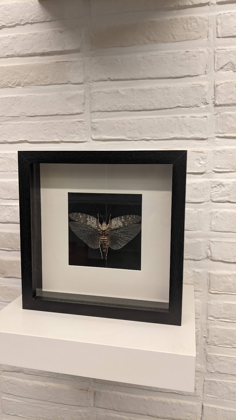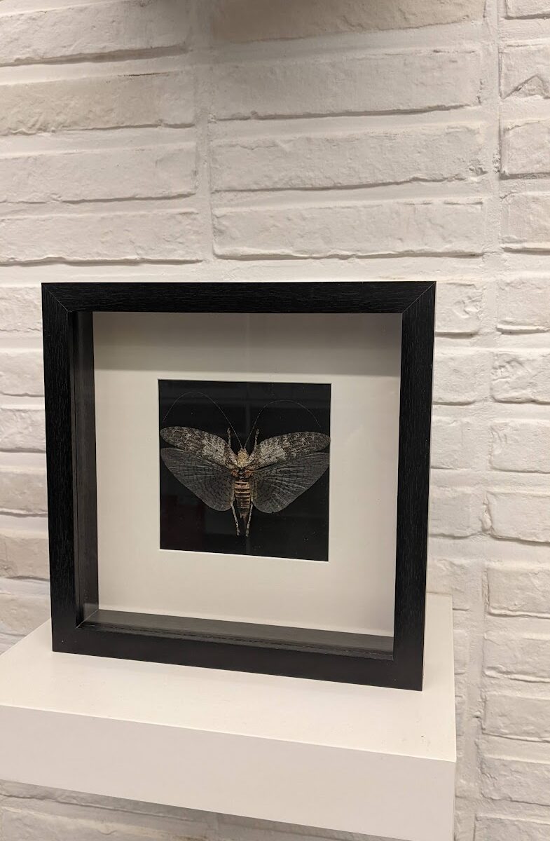 Houten kwaliteitsvolle kader met grijze sabelsprinkhaan.
