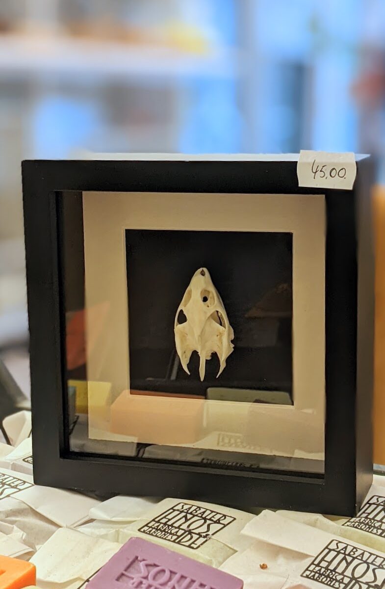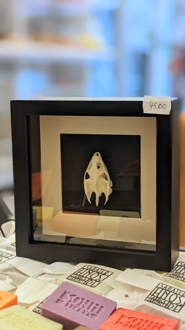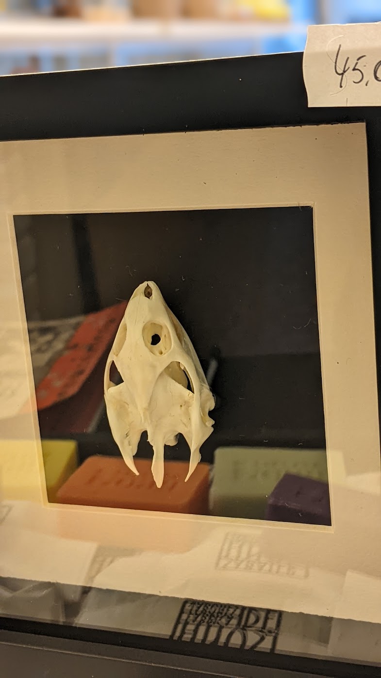 Houten kwaliteitsvolle museumkader met zwarte achtergrond en mooi schedeltje van een schildpad.