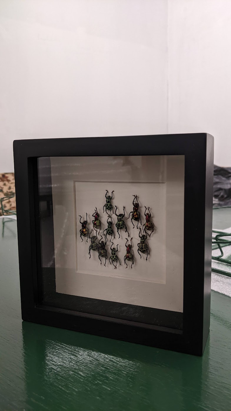 Houten kwaliteitsvolle museumkader met een verzameling van verschillende snuitkevers. Verwonderlijk hoeveel verschillende patronen deze kevertjes hebben.