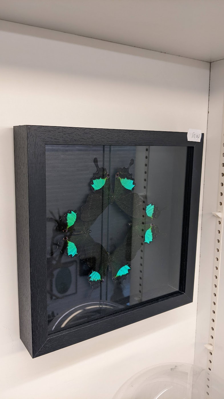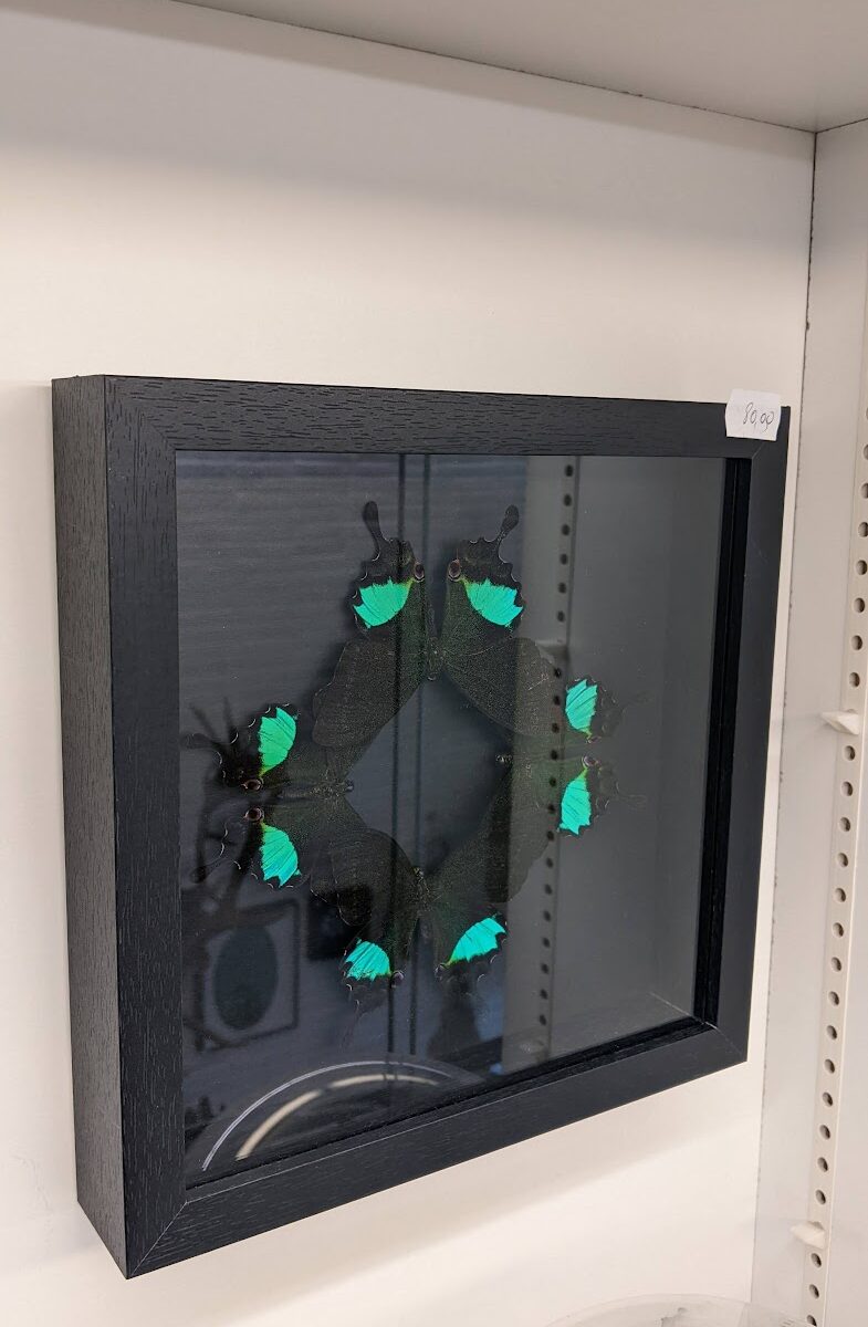 Houten kwaliteitsvolle kader met een compositie van donkere vlinders op een zwarte achtergrond. Door de groene vlekjes krijg je een erg verrassend effect.