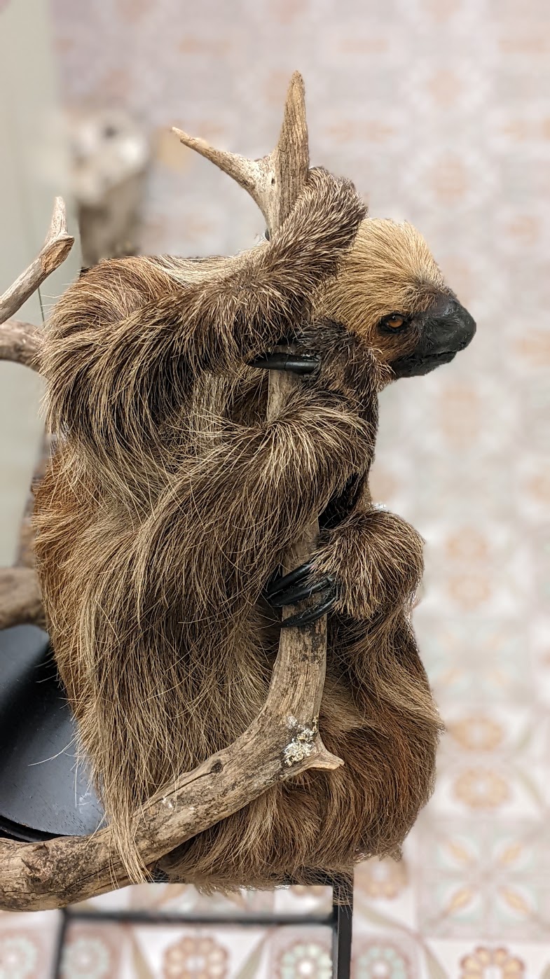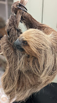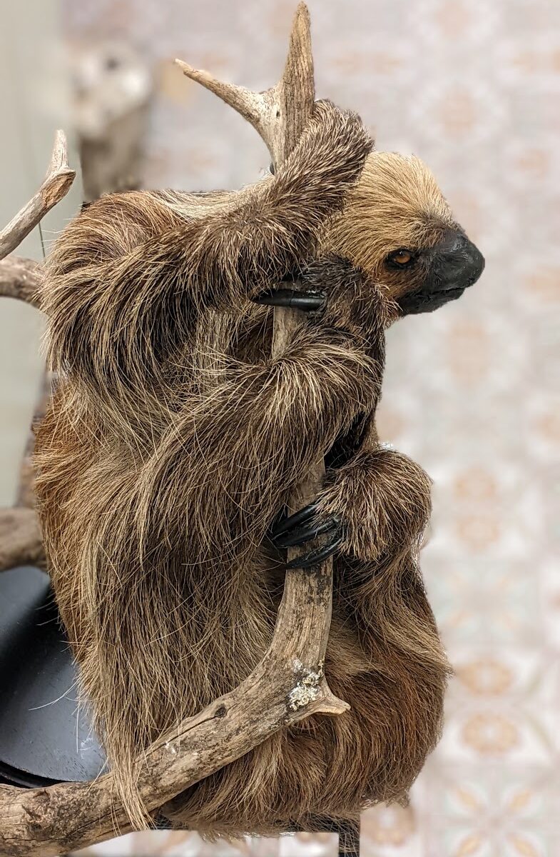 Tweevingerige luiaard, hangend aan een tak. Deze knapperd komt uit Peru, waar hij 15u per dag sliep en 1 keer per week uit de boom kwam voor een grote boodschap.