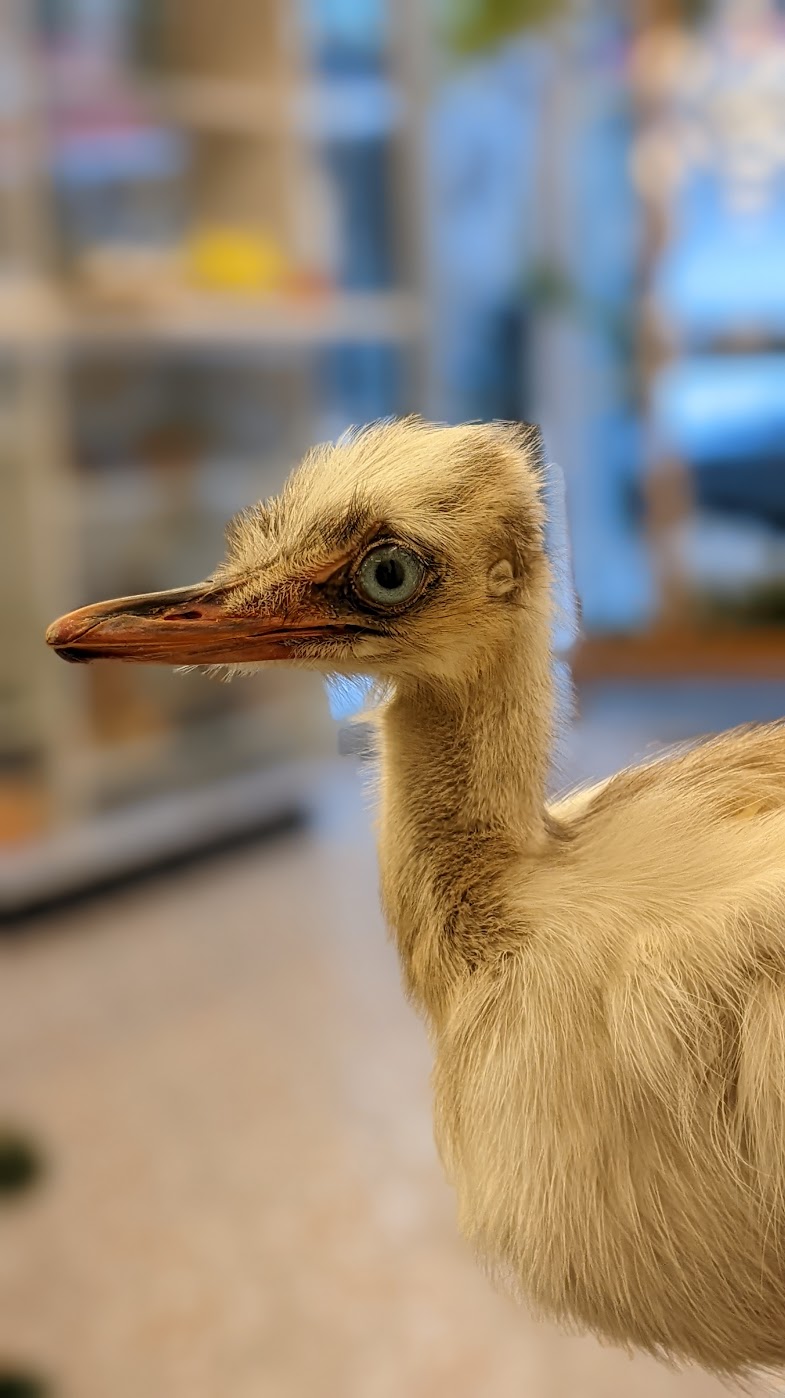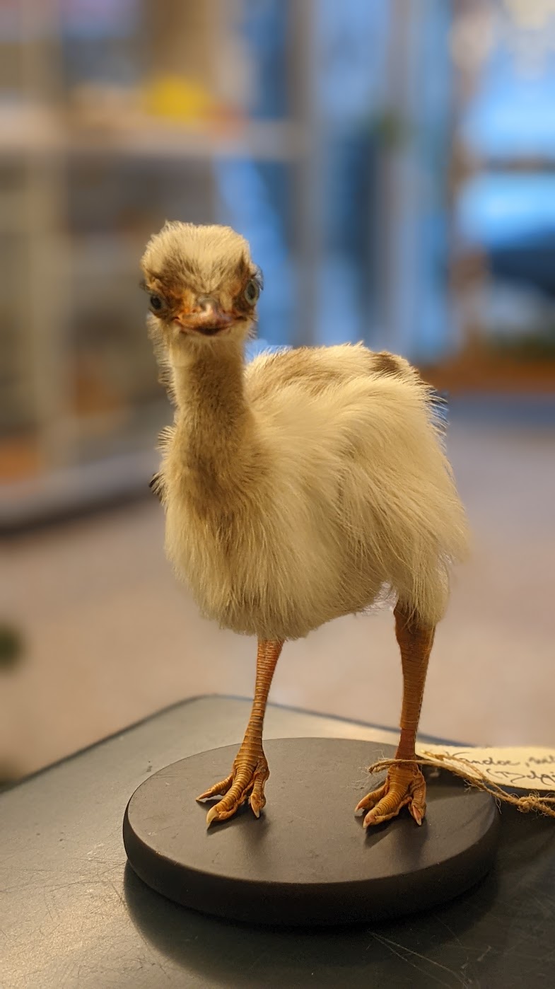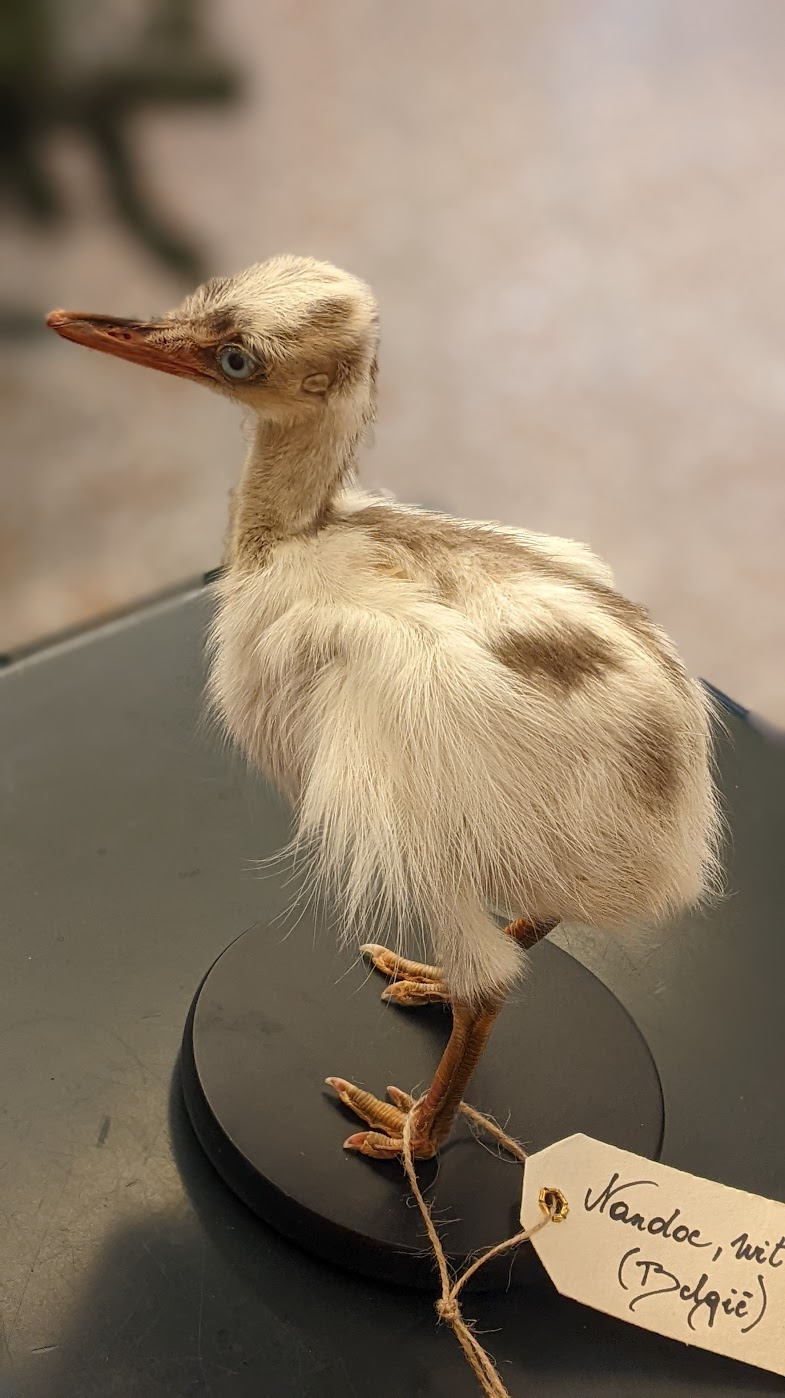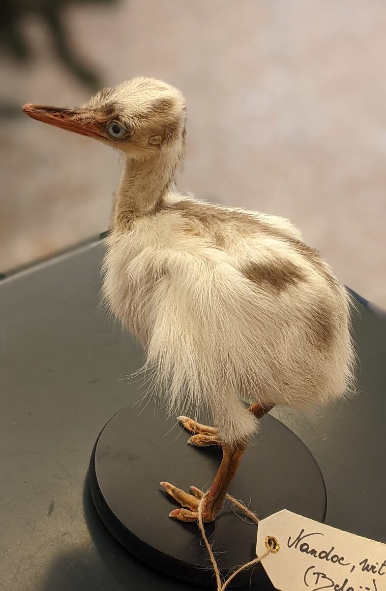 Een sierlijk wit nandoekuiken, vers uit het ei.
