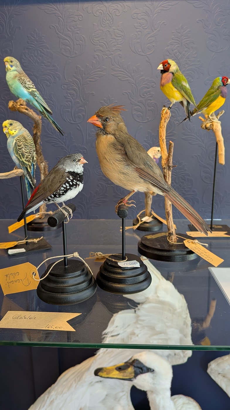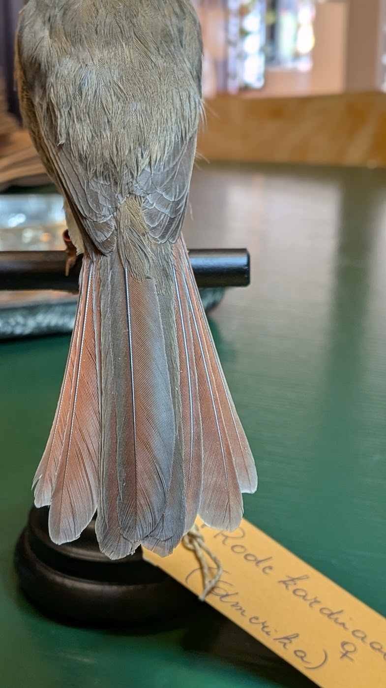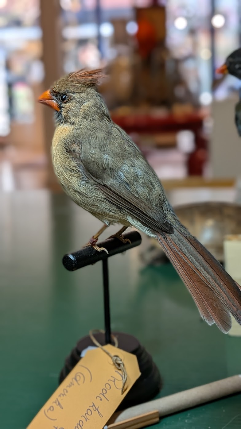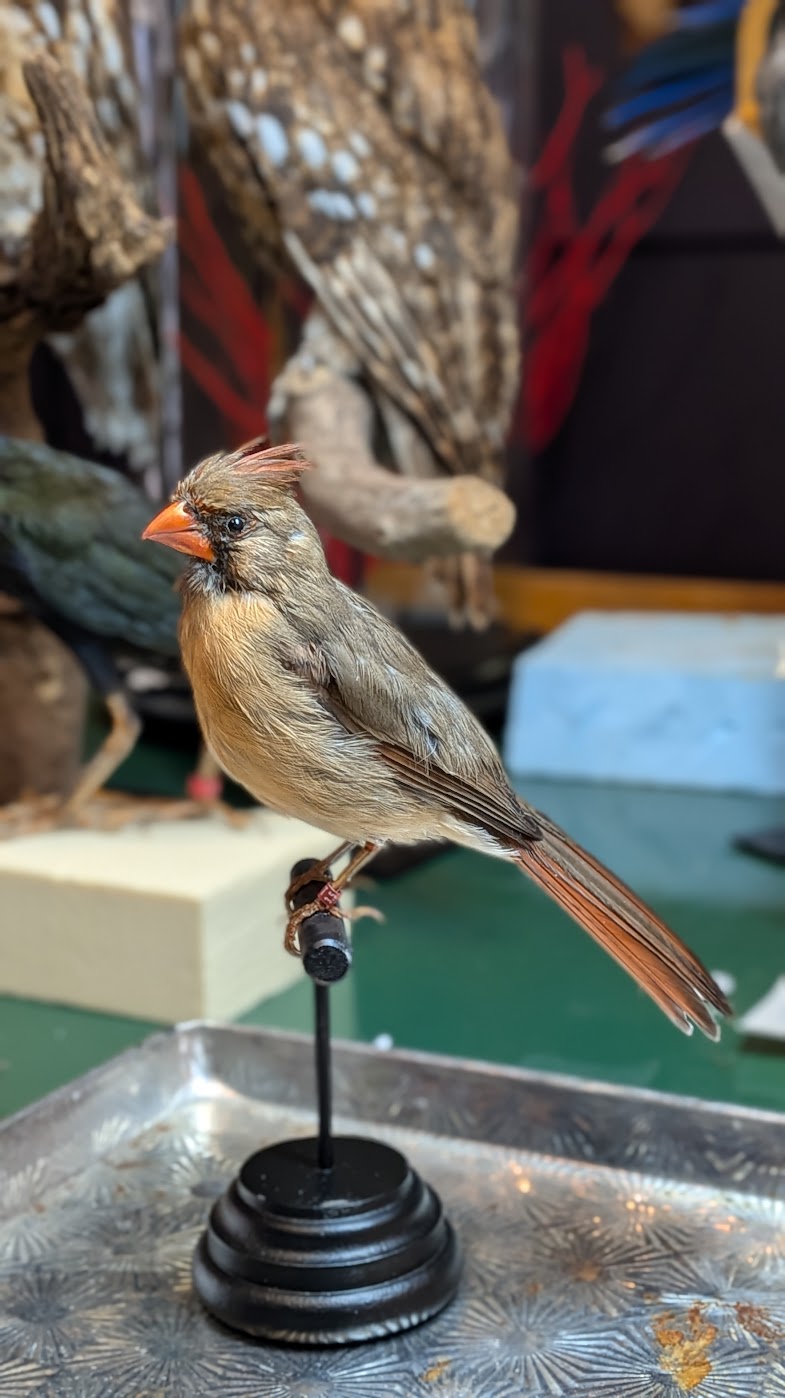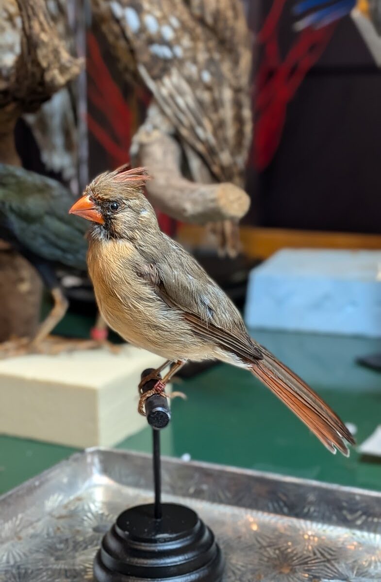 Mooie rode kardinaal op een handgemaakt postament. Dit is een vrouwtje, vandaar niet vlammend rood maar eerder olijfkleurig met wat oranje.