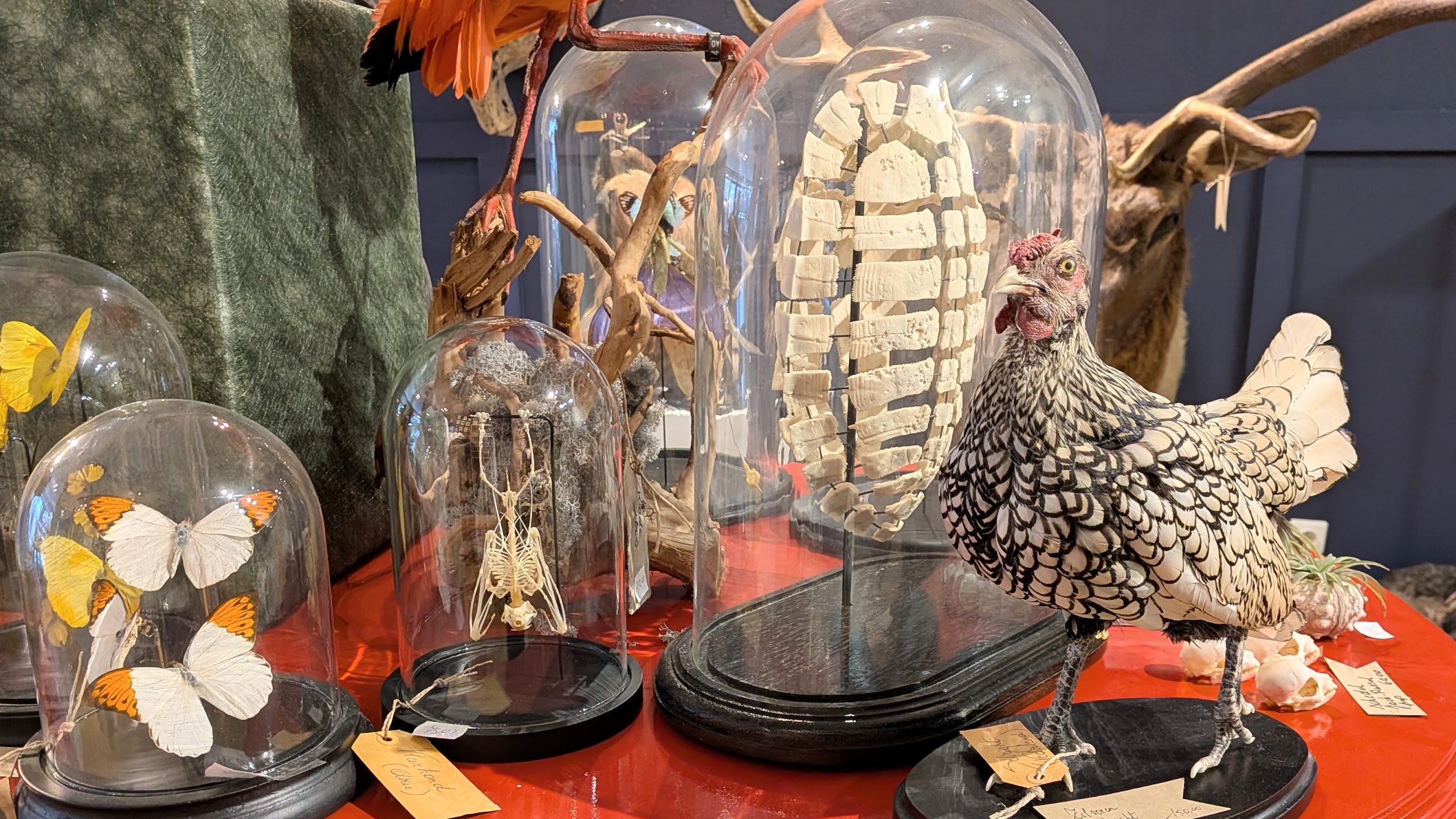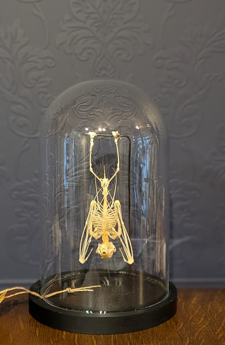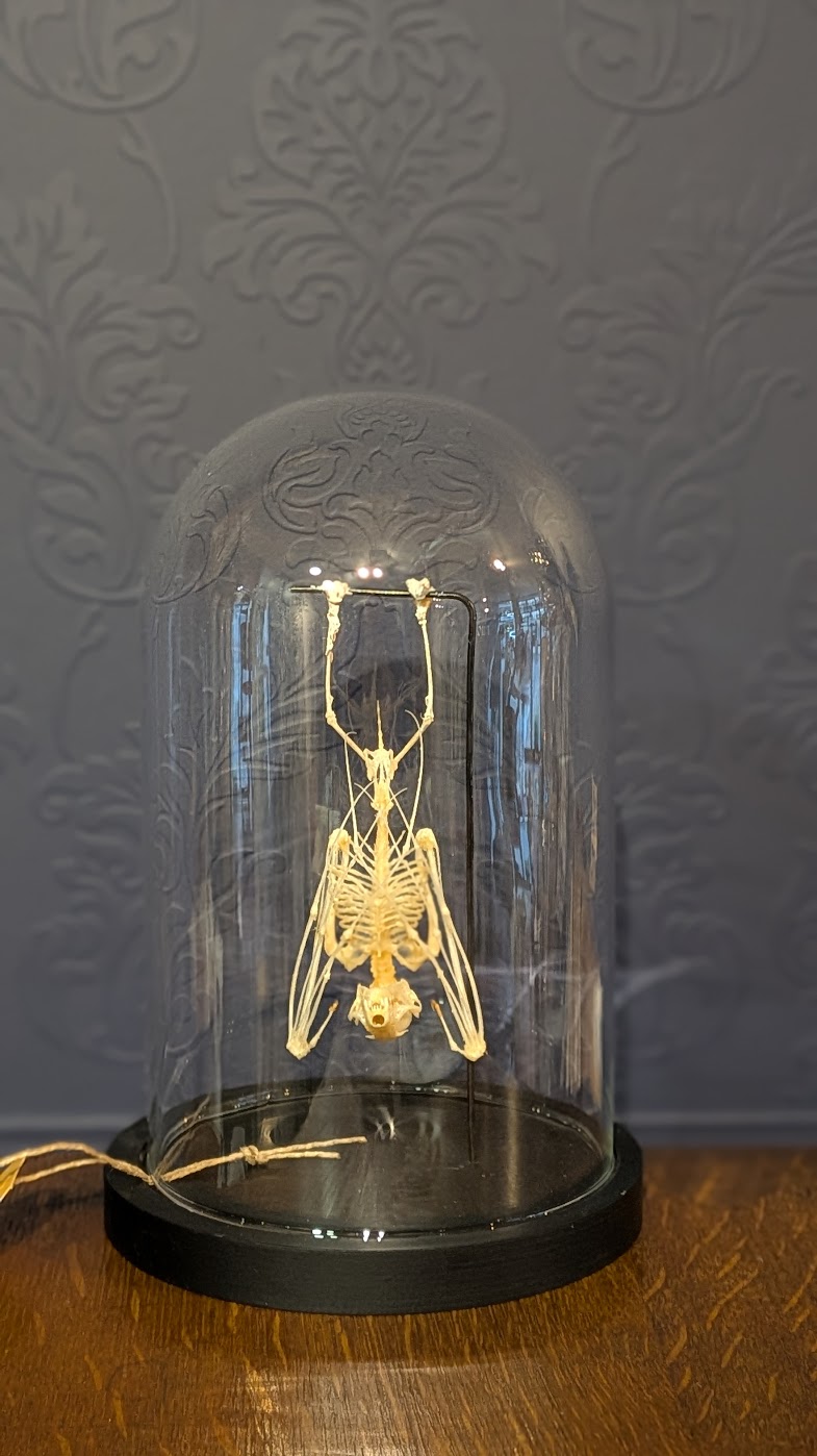Stolp met een hangend skelet van een vleerhondje. Gewoon heel erg cool!