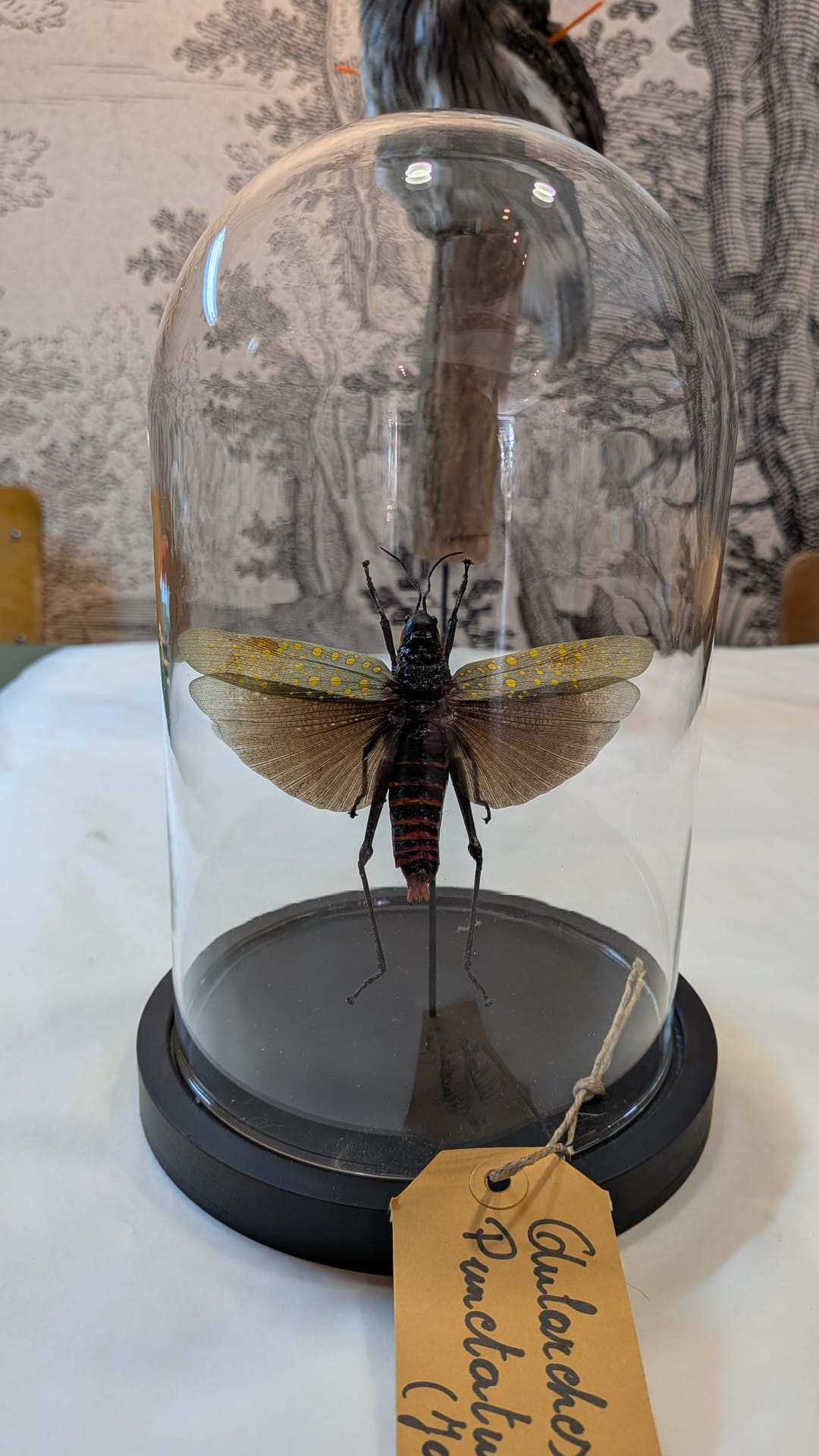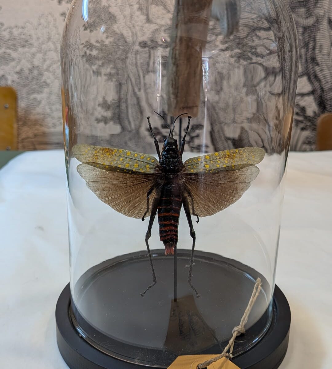 Stolp met mooi gestreepte sprinhaan, rood, geel en zwart!