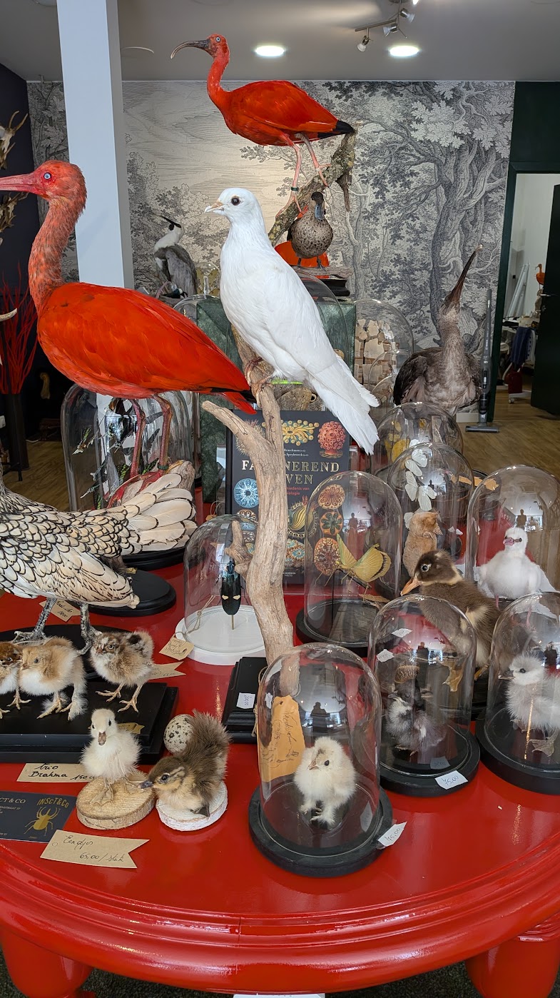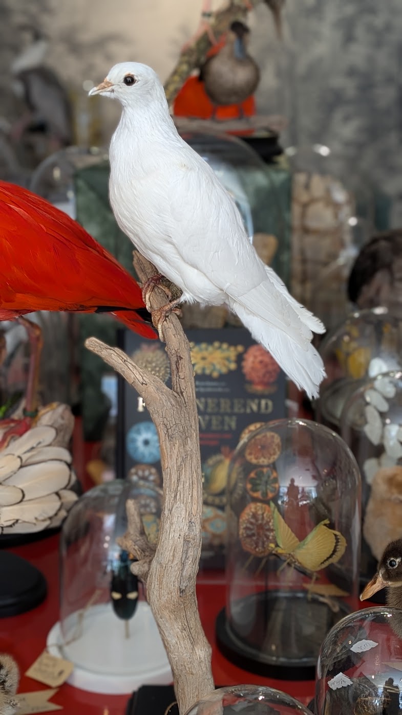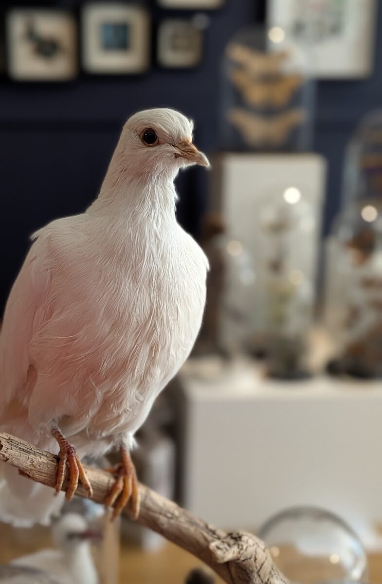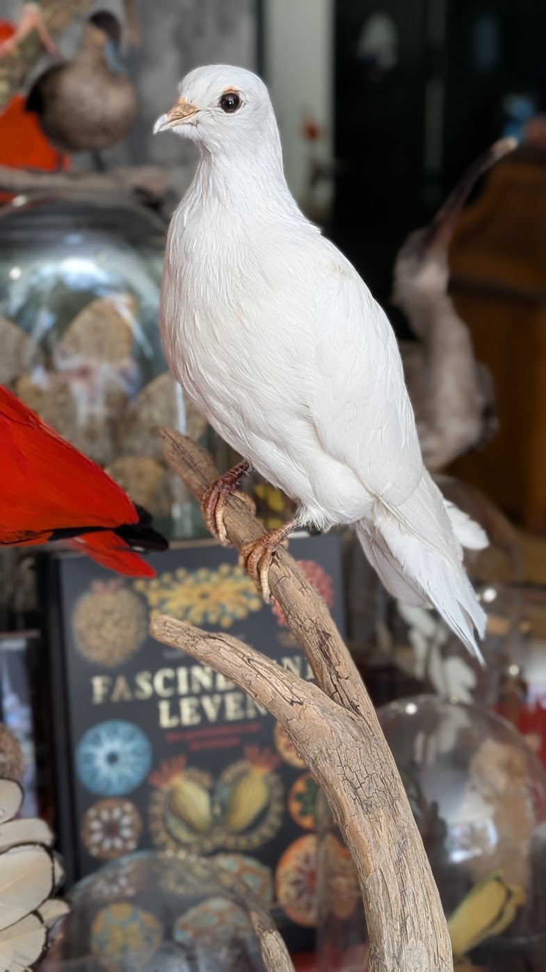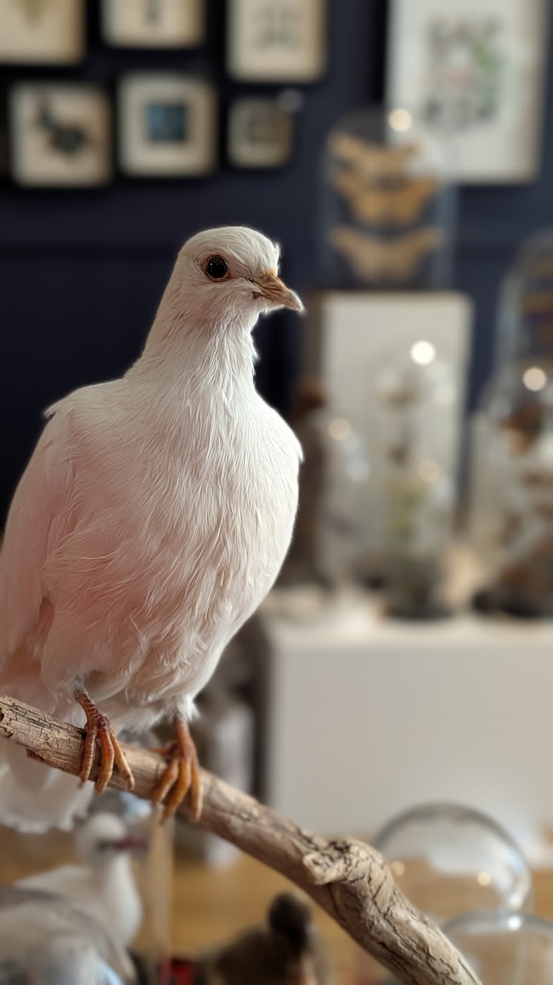 Een puntgave, witte vredesduif op een houten tak en een luxueus postament.